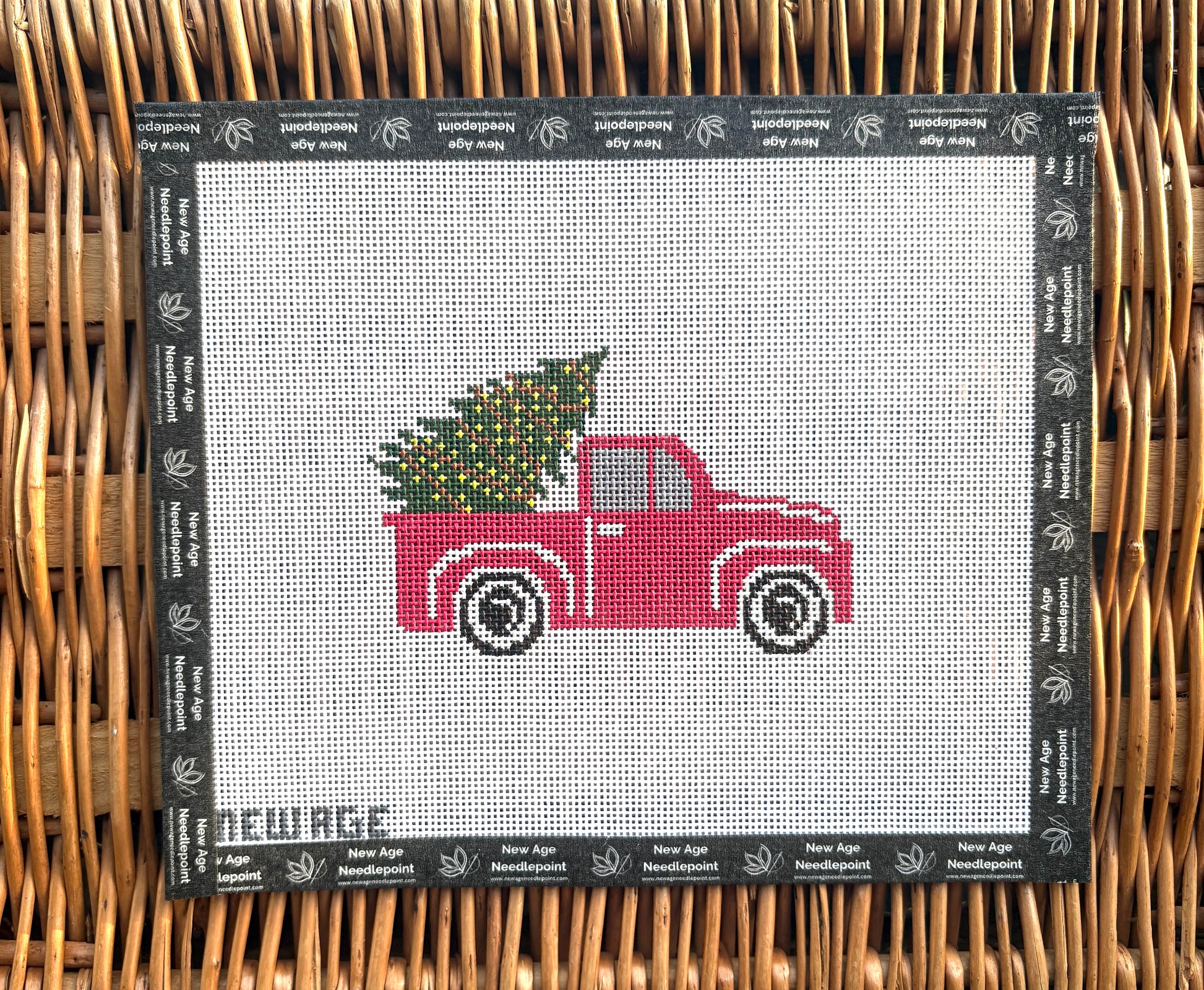Celebrate the season with this charming hand-painted needlepoint canvas featuring a red Christmas truck carrying a festive tree, a timeless design that adds nostalgic cheer to your holiday stitching.