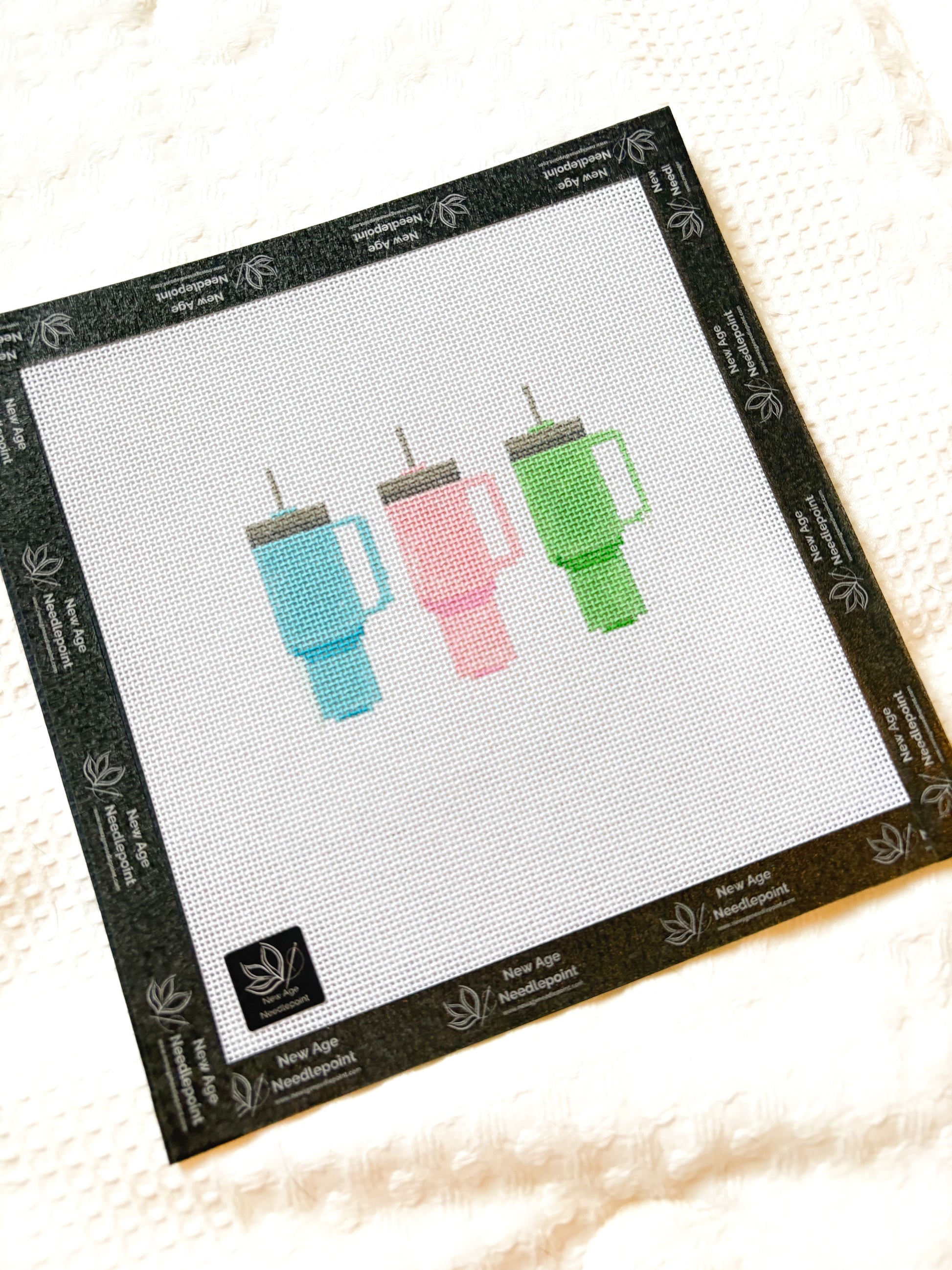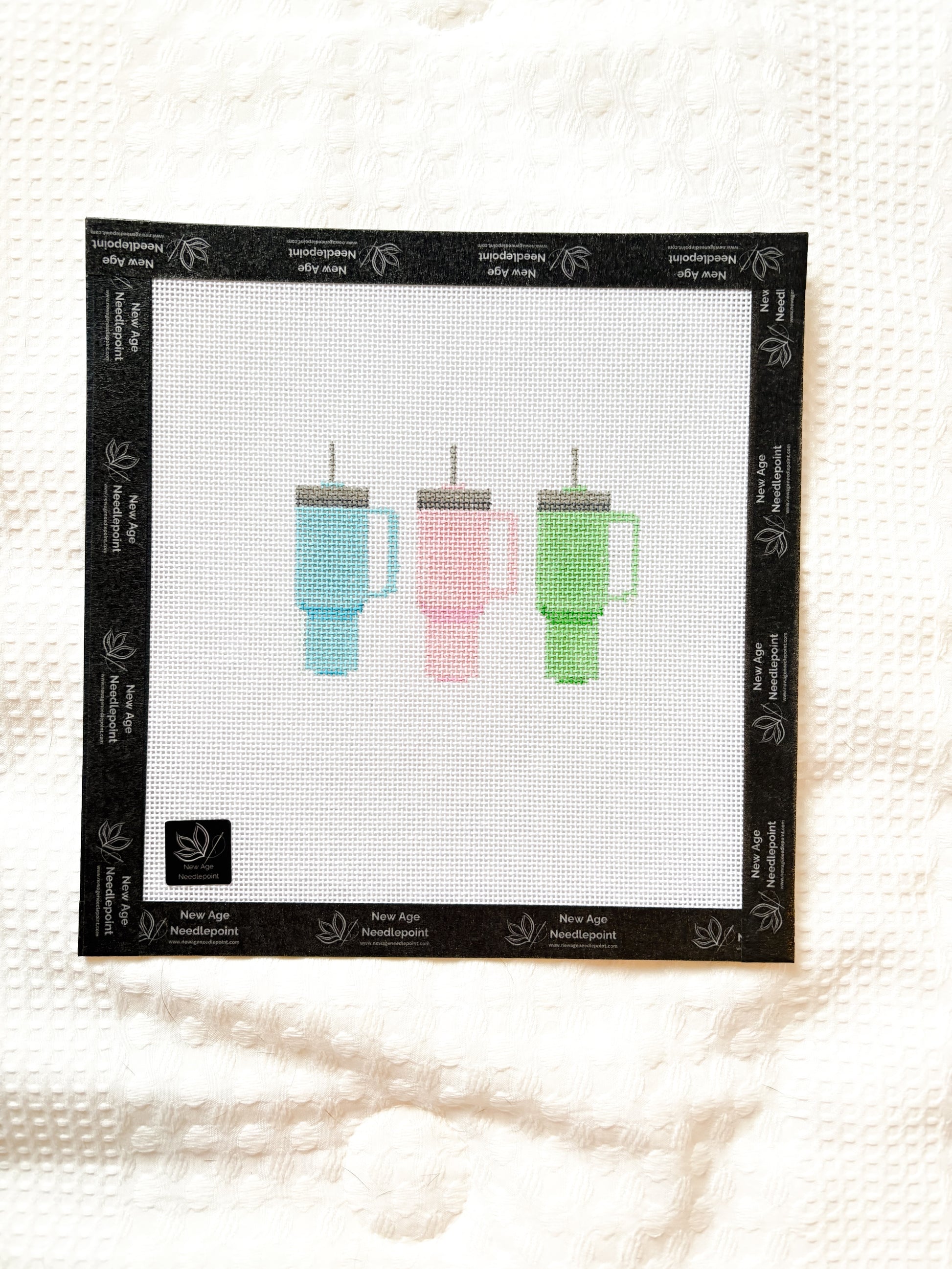 This hand-painted Pastel Tumblers Needlepoint Canvas is the perfect stitch for iced coffee lovers and colorful accessory fans! Featuring a row of three pastel travel tumblers in blue, pink, and green, this charming design adds a cheerful, modern touch to any project — think coasters, bag tags, or framed art.