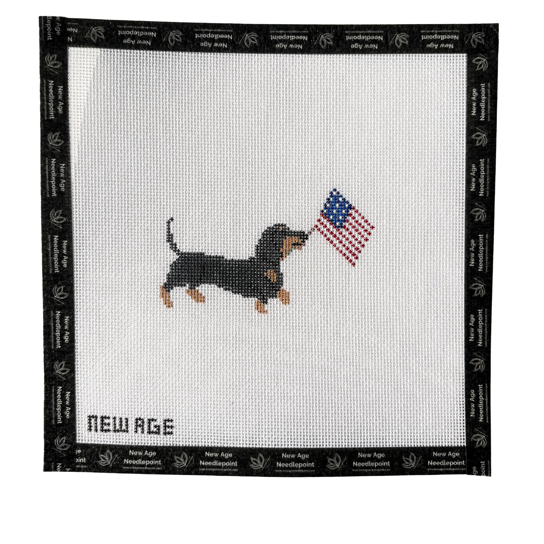 This patriotic dachshund needlepoint canvas features an adorable doxie proudly holding an American flag A charming, whimsical design that’s perfect for summer stitching, patriotic décor, or gifting to dog lovers.