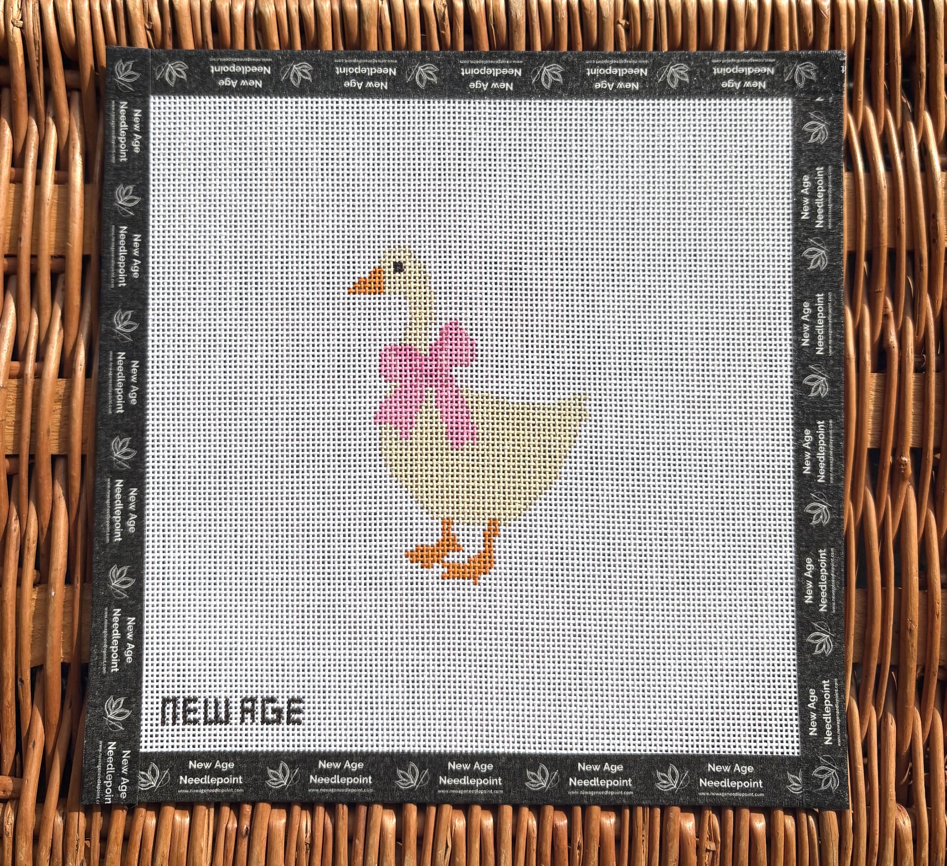 This charming hand-painted needlepoint canvas features a sweet cream-colored goose adorned with a soft pink bow—perfect for spring stitching or nursery décor projects!